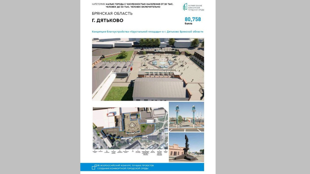 Среди победителей конкурса оказались два города: Клинцы и Дятьково. Город Клинцы удостоился победы в категории малых городов с численностью населения от 50 до 100 тысяч человек. Проект благоустройства Ленинского парка набрал 69,487 балла. Город Дятьково, в свою очередь, вошел в число победителей в категории малых городов с численностью населения от 20 до 50 тысяч человек. Концепция благоустройства «Хрустальной площади» получила высокую оценку в 80,758 балла.