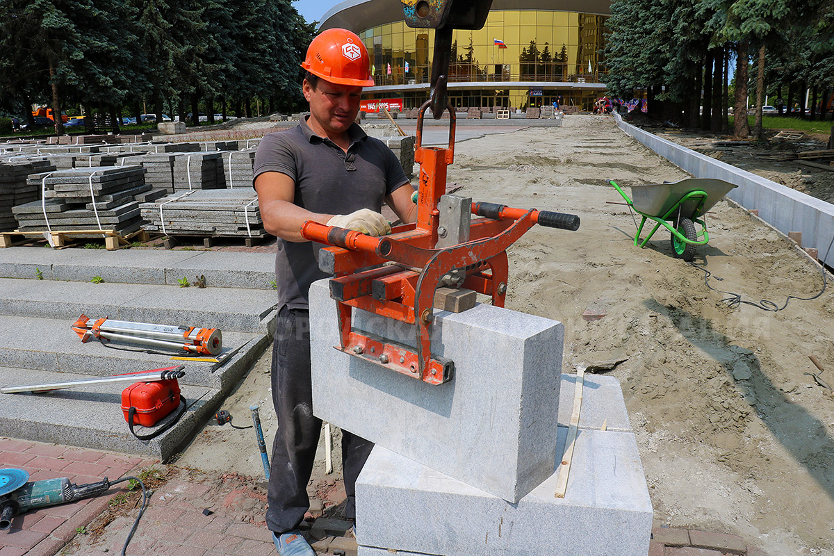 Ежедневно на объекте трудится бригада рабочих, поддерживаемая несколькими единицами техники. Уже начат частичный демонтаж старой плитки, которая, пройдя очистку, будет уложена на новое основание. В случае нехватки или обнаружения дефектов плитка будет заменена новой.