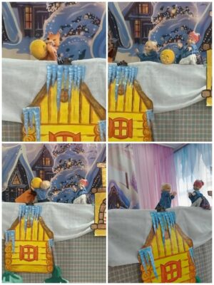 На сцене ожили знакомые герои — Колобок, Волк, Медведь, Заяц и Лиса, которые напомнили детям о правилах безопасности зимой. Персонажи подчеркнули важность соблюдения мер предосторожности, таких как отказ от употребления снега, избегание нахождения под сосульками и запрет выхода на тонкий лед без сопровождения взрослых.