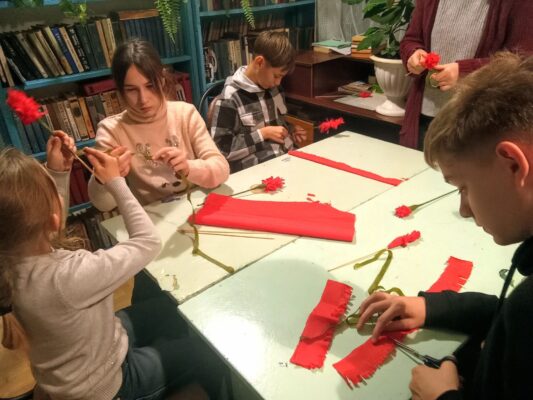Завершилось мероприятие трогательной процедурой изготовления красных гвоздик — цветка, символизирующего память и благодарность тем, кто пал в боях за свободу и независимость нашей Родины.