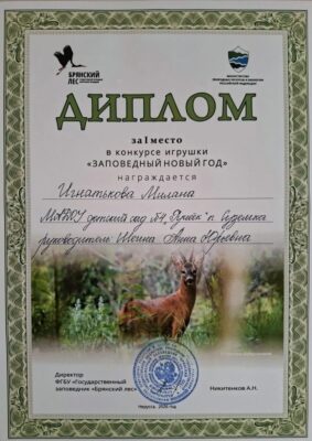 Среди отмеченных жюри работ особое внимание привлекла игрушка воспитанницы детского сада «Ручеёк» Миланы Игнатьковой. Её творческая работа заняла первое место в конкурсе и теперь украшает одну из новогодних елей заповедника.